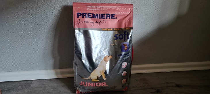 Premiere Soft Junior Geflügel ist ein halbfeuchtes Trockenfutter für Welpen. Fay ist nun knapp fünf Monate alt und ist unsere Probandin bei unserem kleinen Test. Premiere ist eine der Hausmarken von Fressnapf und wird dort als Premiumfutter angeboten. Die Herstellung soll nährstoffschonend sein und mit viel Fleisch erfolgen. Leider haben wir auf der Verpackung von Premiere Soft Junior Geflügel keinen Hinweis über den tatsächlichen Fleischanteil finden können.